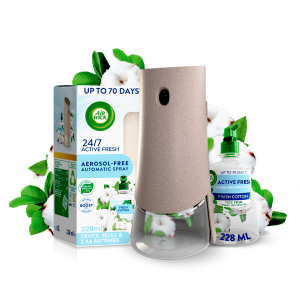 The Air Wick 24/7 Active Fresh Automatic Spray is an air freshener that delivers 24/7 odour neutralisation in your bathroom and kitchen. Designed to remove dog and musty smells in your home - as well as bin and mould smells from your kitchen. Available in a variety of fresh scents including:, Fresh Cotton, Eucalyptus & Freesia, and Vanilla & Honeysuckle.
