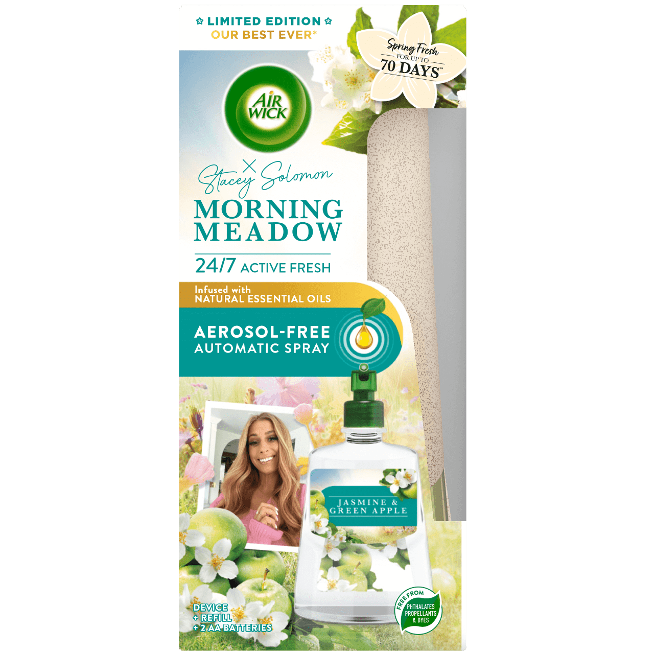 Stacey Solomon Morning Meadow. Air Wick 24/7 Active Fresh is Air Wick’s first aerosol-free and best ever automatic air freshener. Our latest odour neutraliser is infused with natural essential oils for long lasting fragrance to tackle pet odour removal and banish bathroom smells and kitchen malodour for up to 70 days*.